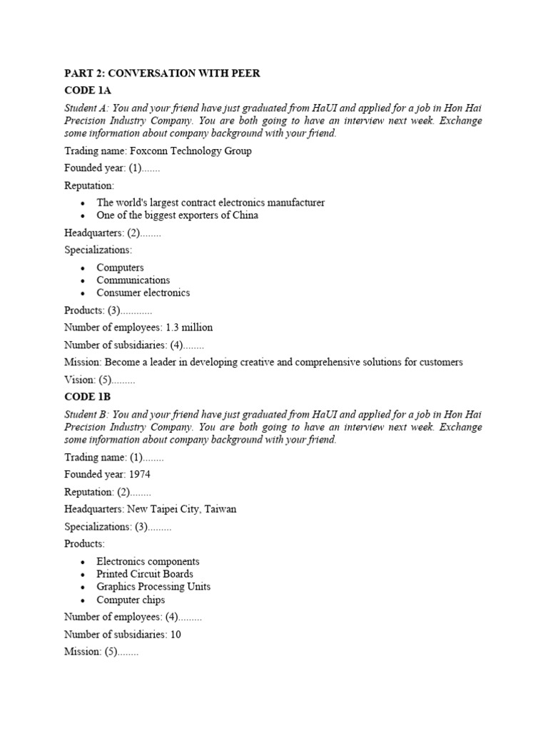 Student B: You and your friend have just graduated from HaUI and applied for a job in Hon Hai