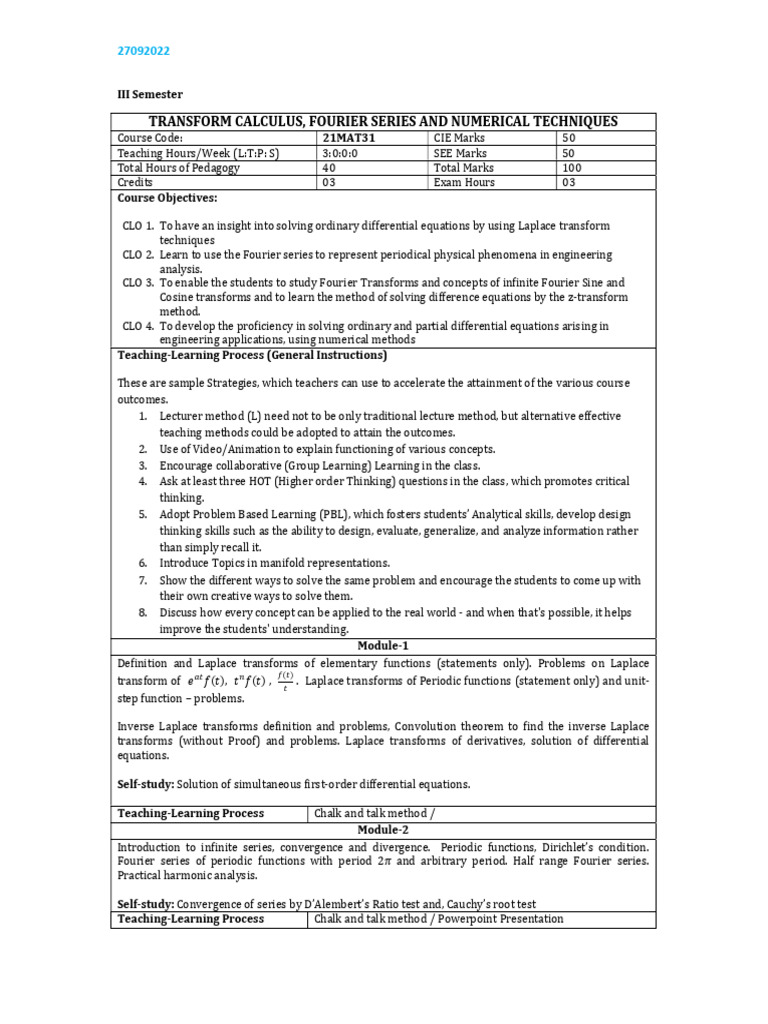 CLO 3. To enable the students to study Fourier Transforms and concepts of infinite Fourier Sine and