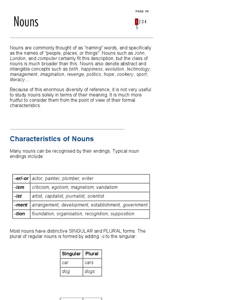 Most nouns have distinctive SINGULAR and PLURAL forms. The plural of regular nouns is formed by adding -s to the singular: