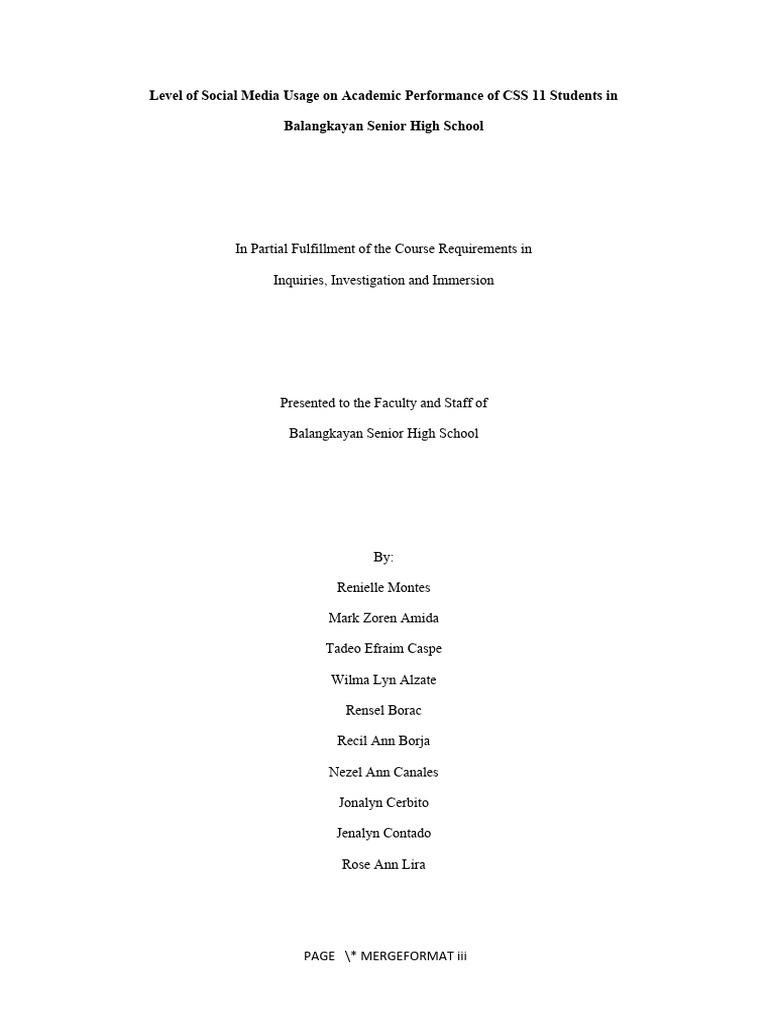 The research proposal titled “Level of Social Media Usage on Academic Performance of CSS 11