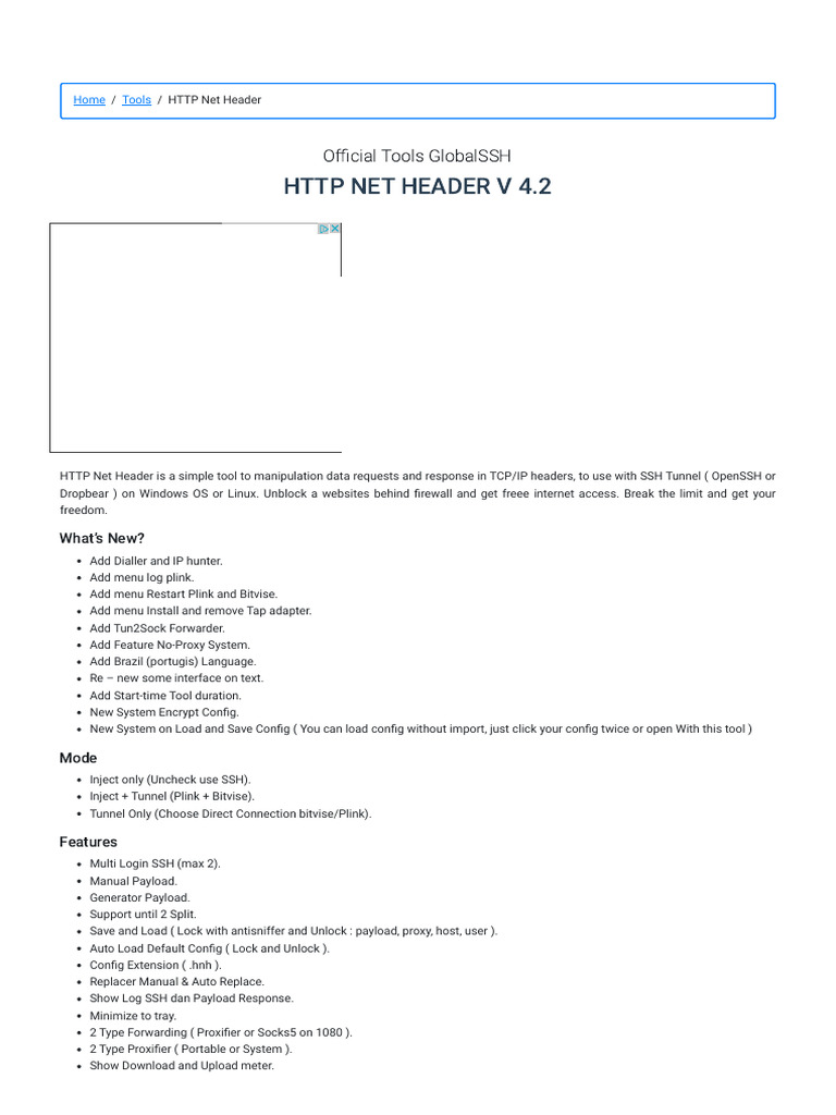 HTTP Net Header is a simple tool to manipulation data requests and response in TCP/IP headers, to use with SSH Tunnel ( OpenSSH or