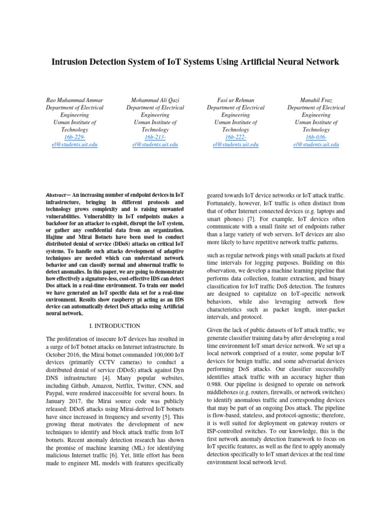 Intrusion Detection System of IoT Systems Using Artificial Neural Network