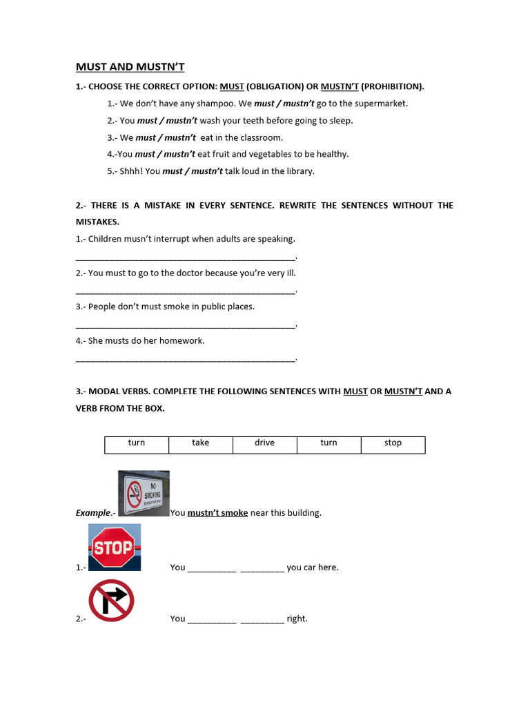 3.- MODAL VERBS. COMPLETE THE FOLLOWING SENTENCES WITH MUST OR MUSTN’T AND A