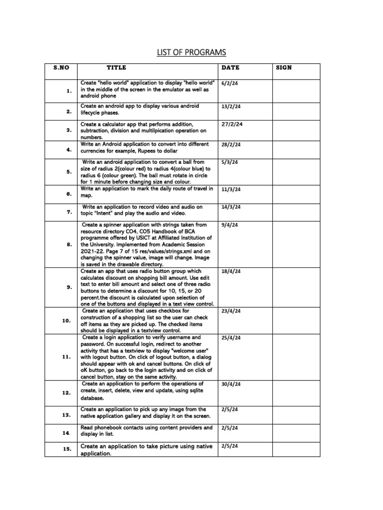 S.NO TITLE DATE SIGN