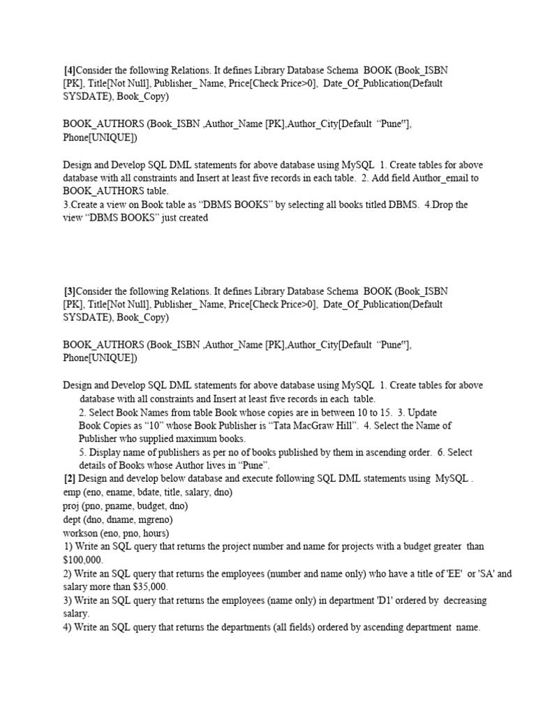 Design and Develop SQL DML statements for above database using MySQL 1. Create tables for above