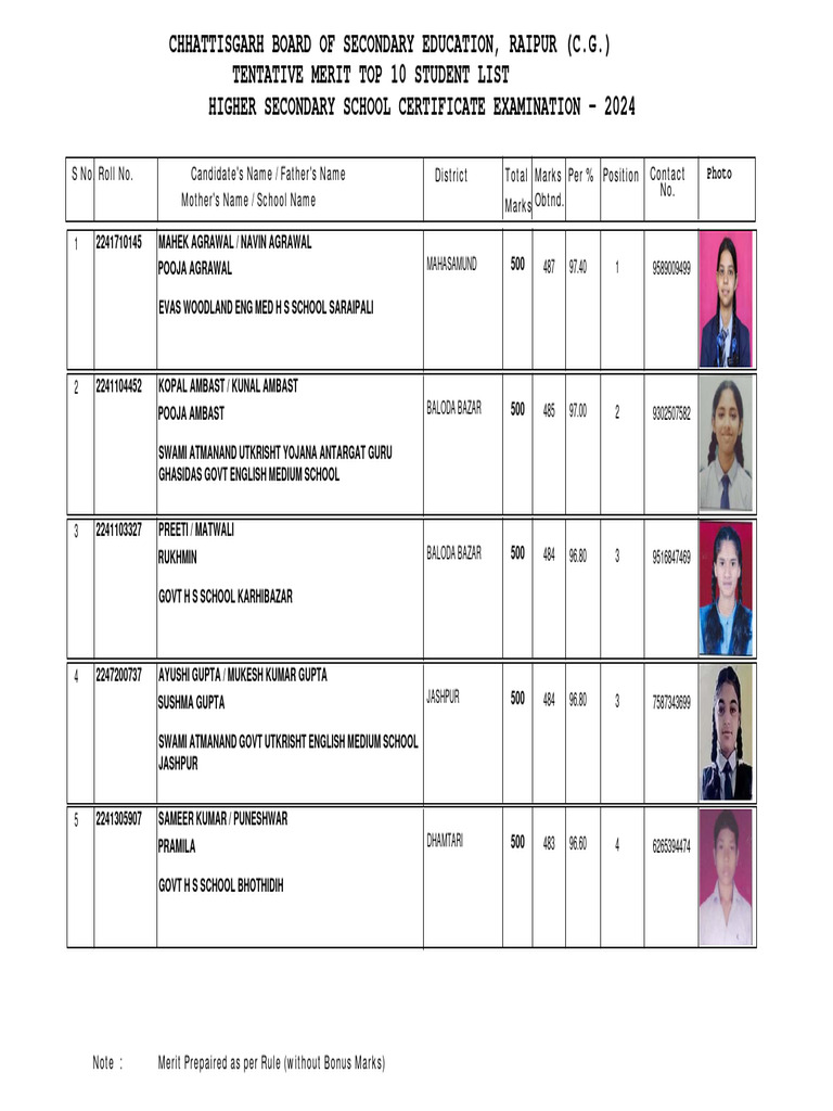 POOJA AGRAWAL MAHASAMUND 500 487 97.40 1 9589009499