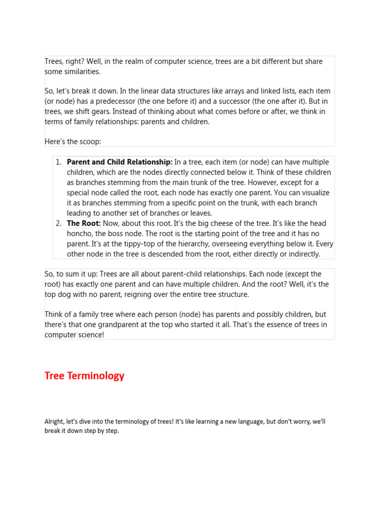 1. Parent and Child Relationship: In a tree, each item (or node) can have multiple