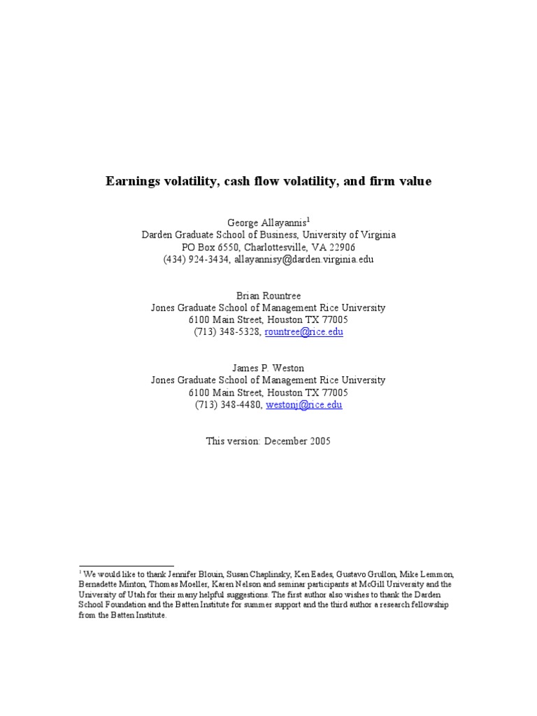 Earnings Volatility, Cash Flow Volatility, and Firm Value: Rountree@rice - Edu