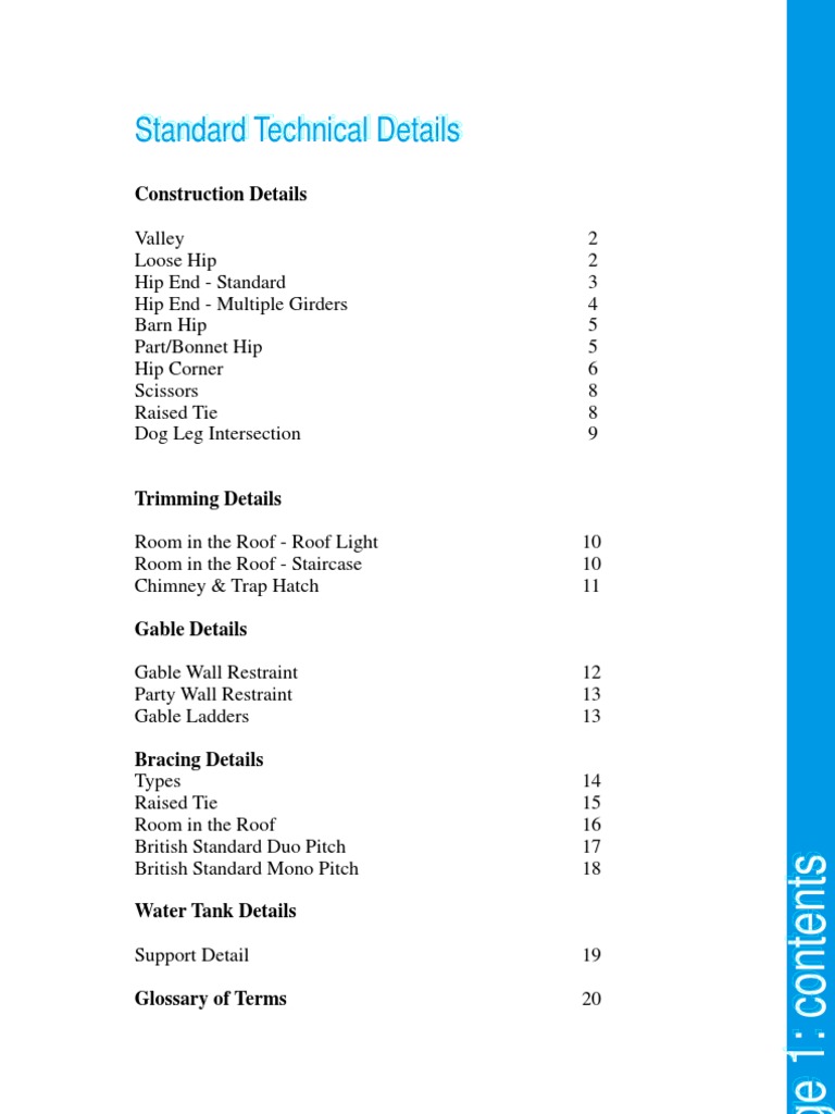 Construction Details Valley Loose Hip Hip End - Standard Hip End - Multiple Girders Barn Hip Part/Bonnet Hip Hip Corner Scissors Raised Tie Dog Leg Intersection Trimming Details Room in the Roof - Roof Light Room in the Roof - Staircase Chimney & Trap Hatch Gable Details Gable Wall Restraint Party Wall Restraint Gable Ladders Bracing Details Types Raised Tie Room in the Roof British Standard Duo Pitch British Standard Mono Pitch Water Tank Details Support Detail Glossary of Terms 19 20 12 13 13 14 15 16 17 18 10 10 11 2 2 3 4 5 5 6 8 8 9