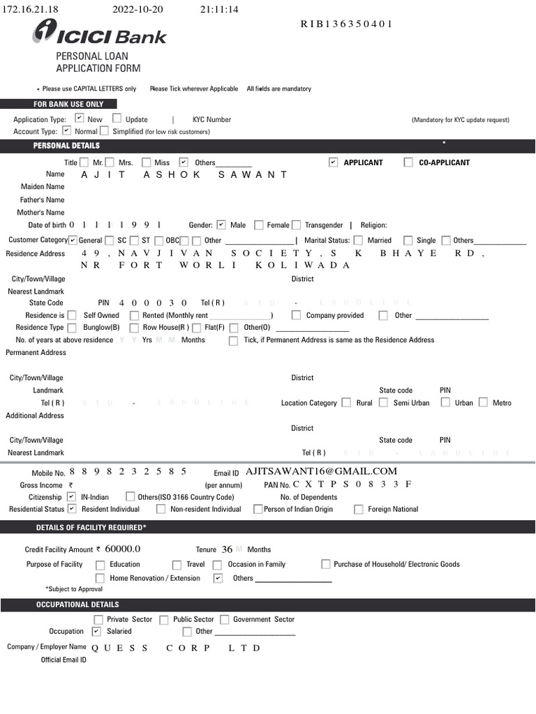 Personal Loan Facility Application No.: R I B1 3 6 3 5 0 4 0 1