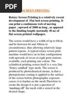 It is done either with flat or cylindrical screens made of silk threads, nylon, polyester, vinyon or metal. The printing paste or dye is poured on the screen and forced through its unblocked areas onto the fabric. Based on the type of the screen used, it is known as 'Flat Screen Printing' or 'Rotary Screen Printing'.