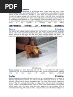 There are various methods of printing in which one of the above three techniques is used Block Printing, Roller Printing, Duplex Printing, Stencil Printing, Screen Printing, Transfer Printing, Blotch Printing, Jet Spray Printing, Electrostatic Printing, Photo Printing, Differential Printing, Warp Printing, Batik Dyeing, Tie Dyeing, Airbrush (Spray) Painting and Digital printing.