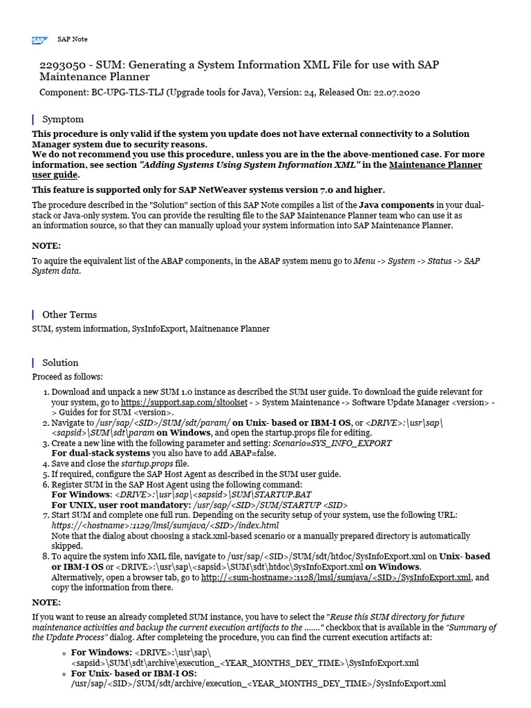 2293050 - SUM: Generating a System Information XML File for use with SAP