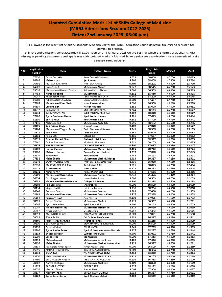 Updated Cumulative Merit List of Shifa College of Medicine