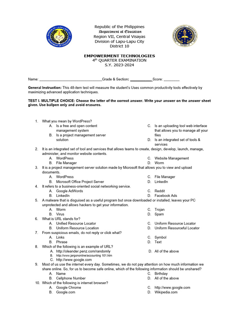 General Instruction: This 48-item test will measure the student’s Uses common productivity tools effectively by