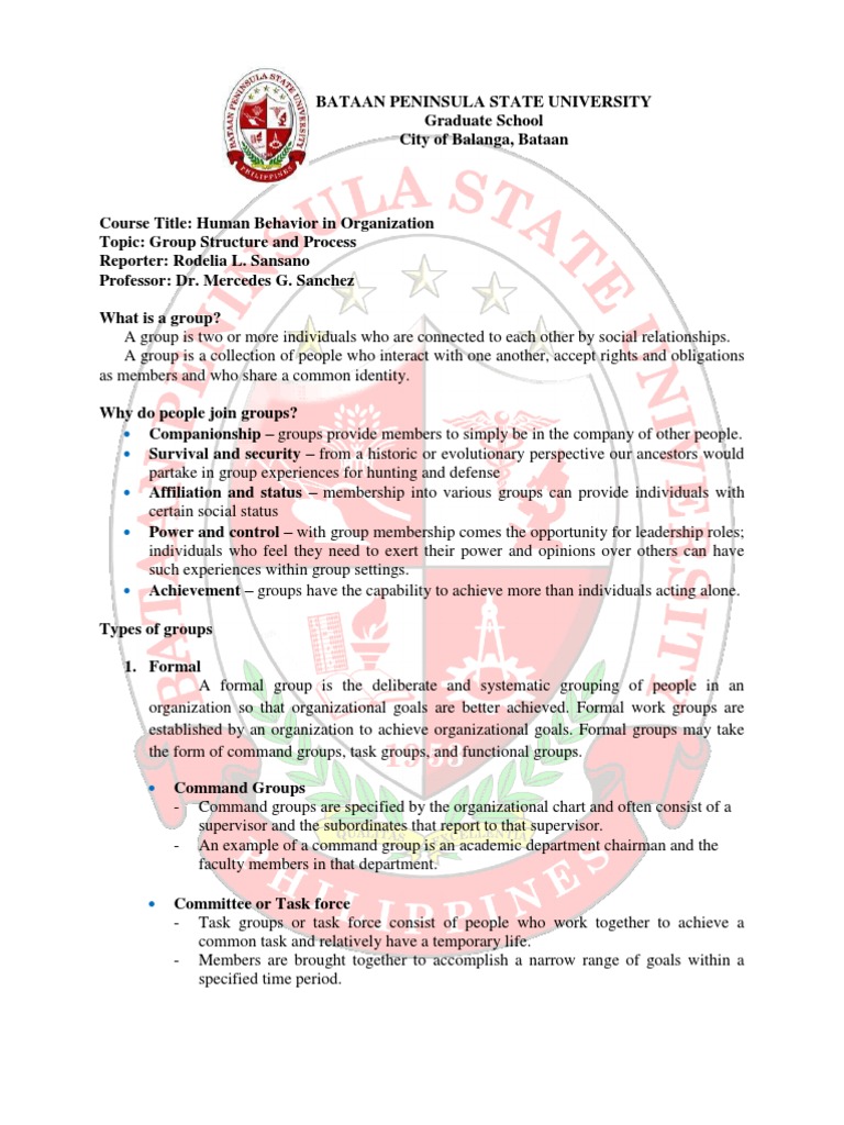Course Title: Human Behavior in Organization Topic: Group Structure and Process Reporter: Rodelia L. Sansano Professor: Dr. Mercedes G. Sanchez What is a group? A group is two or more individuals who are connected to each other by social relationships. A group is a collection of people who interact with one another, accept rights and obligations as members and who share a common identity. Why do people join groups? Companionship groups provide members to simply be in the company of other people. Survival and security from a historic or evolutionary perspective our ancestors would partake in group experiences for hunting and defense Affiliation and status membership into various groups can provide individuals with certain social status Power and control with group membership comes the opportunity for leadership roles; individuals who feel they need to exert their power and opinions over others can have such experiences within group settings. Achievement groups have the capability to achieve more than individuals acting alone. Types of groups 1. Formal A formal group is the deliberate and systematic grouping of people in an organization so that organizational goals are better achieved. Formal work groups are established by an organization to achieve organizational goals. Formal groups may take the form of command groups, task groups, and functional groups. Command Groups - Command groups are specified by the organizational chart and often consist of a supervisor and the subordinates that report to that supervisor. - An example of a command group is an academic department chairman and the faculty members in that department. Committee or Task force - Task groups or task force consist of people who work together to achieve a common task and relatively have a temporary life. - Members are brought together to accomplish a narrow range of goals within a specified time period.