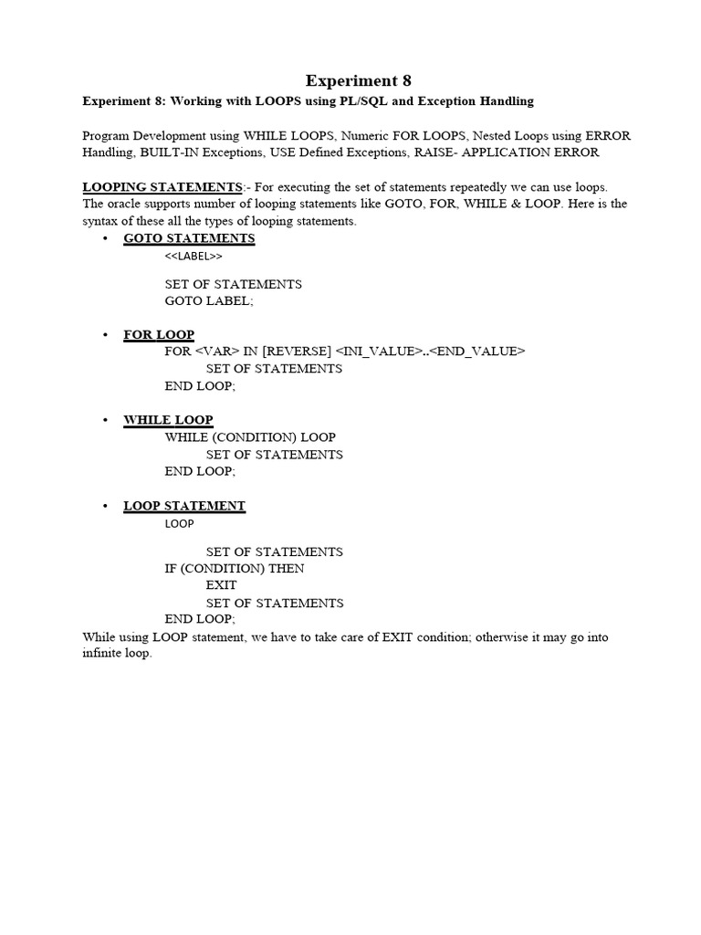 Experiment 8: Working with LOOPS using PL/SQL and Exception Handling