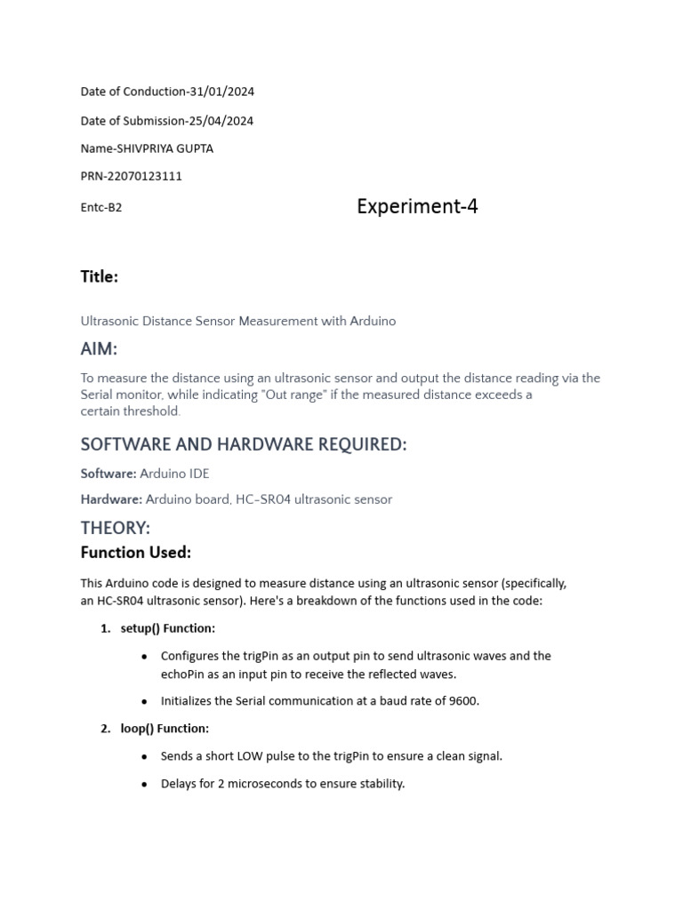 an HC-SR04 ultrasonic sensor). Here's a breakdown of the functions used in the code: