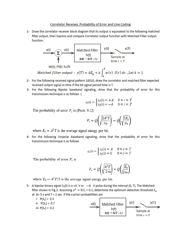 1- Draw the correlator receiver block diagram that its output is equivalent to the following matched