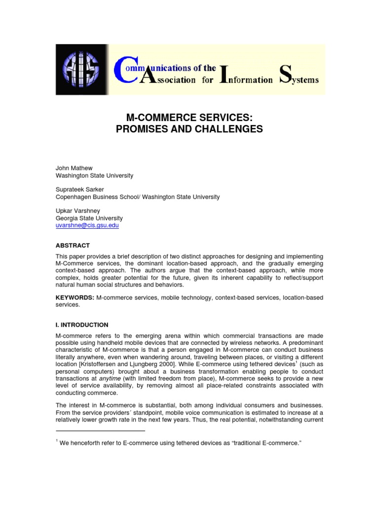 John Mathew Washington State University Suprateek Sarker Copenhagen Business School/ Washington State University Upkar Varshney Georgia State University uvarshne@cis.gsu.edu ABSTRACT This paper provides a brief description of two distinct approaches for designing and implementing M-Commerce services, the dominant location-based approach, and the gradually emerging context-based approach. The authors argue that the context-based approach, while more complex, holds greater potential for the future, given its inherent capability to reflect/support natural human social structures and behaviors. KEYWORDS: M-commerce services, mobile technology, context-based services, location-based services. I. INTRODUCTION M-commerce refers to the emerging arena within which commercial transactions are made possible using handheld mobile devices that are connected by wireless networks. A predominant characteristic of M-commerce is that a person engaged in M-commerce can conduct business literally anywhere, even when wandering around, traveling between places, or visiting a different location [Kristoffersen and Ljungberg 2000]. While E-commerce using tethered devices1 (such as personal computers) brought about a business transformation enabling people to conduct transactions at anytime (with limited freedom from place), M-commerce seeks to provide a new level of service availability, by removing almost all place-related constraints associated with conducting commerce. The interest in M-commerce is substantial, both among individual consumers and businesses. From the service providers standpoint, mobile voice communication is estimated to increase at a relatively lower growth rate in the next few years. Thus, the real potential, notwithstanding current