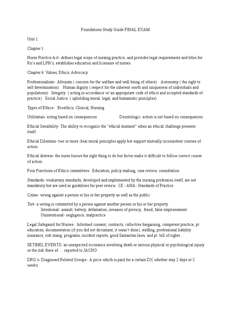 Foundations Study Guide FINAL EXAM Unit 1 Chapter 1 Nurse Practice Act- defines legal scope of nursing practice,
