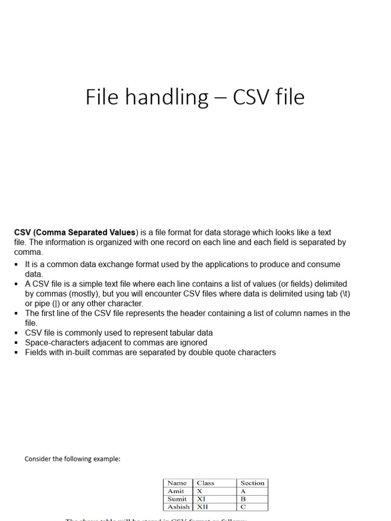 ▪ A CSV file is a simple text file where each line contains a list of values (or fields) delimited