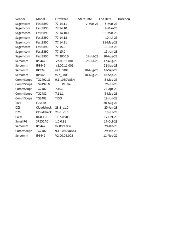 Vendor Model Firmware Start Date End Date Duration