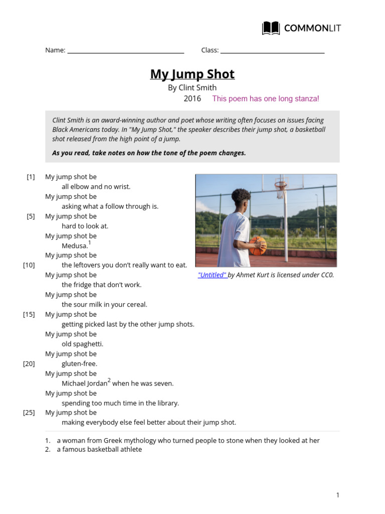 1. The speaker starts the poem by describing their jump shot in a self-deprecating and