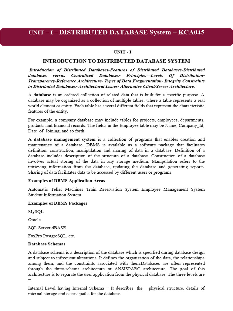 UNIT – I – DISTRIBUTED DATABASE System – KCA045