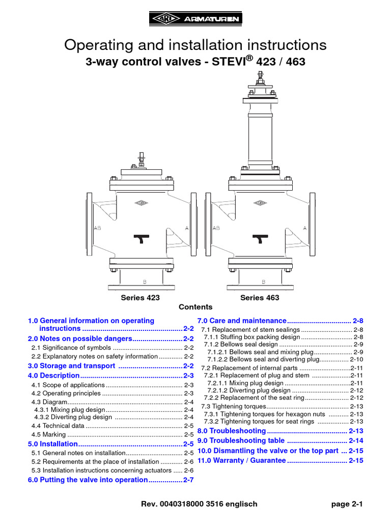 5.1 General notes on installation............................... 2-5 10.0 Dismantling the valve or the top part ... 2-15