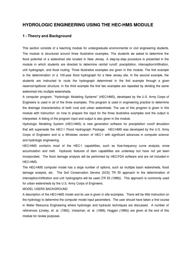 interception/infiltration and unit hydrographs will be used (TR 55 (1986)). This approach is commonly used for urban watersheds by the U.S. Army Corps of Engineers. MODEL USERS BACKGROUND A description of the HEC-HMS model and its use is given in site examples. There will be little instruction on the hydrology to determine the computer model input parameters. The user should have taken a first course in Water Resource Engineering where hydrologic and hydraulic techniques are discussed. A number of references ( insley, et. al. (1992), Viessman, et. al. (1989), Hoggan (1989)) are given at the end of this L module for review purposes.