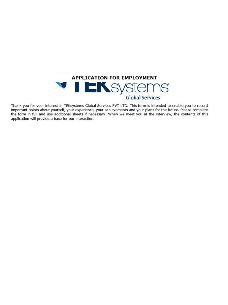 Thank you for your interest in TEKsystems Global Services PVT LTD. This form is intended to enable you to record