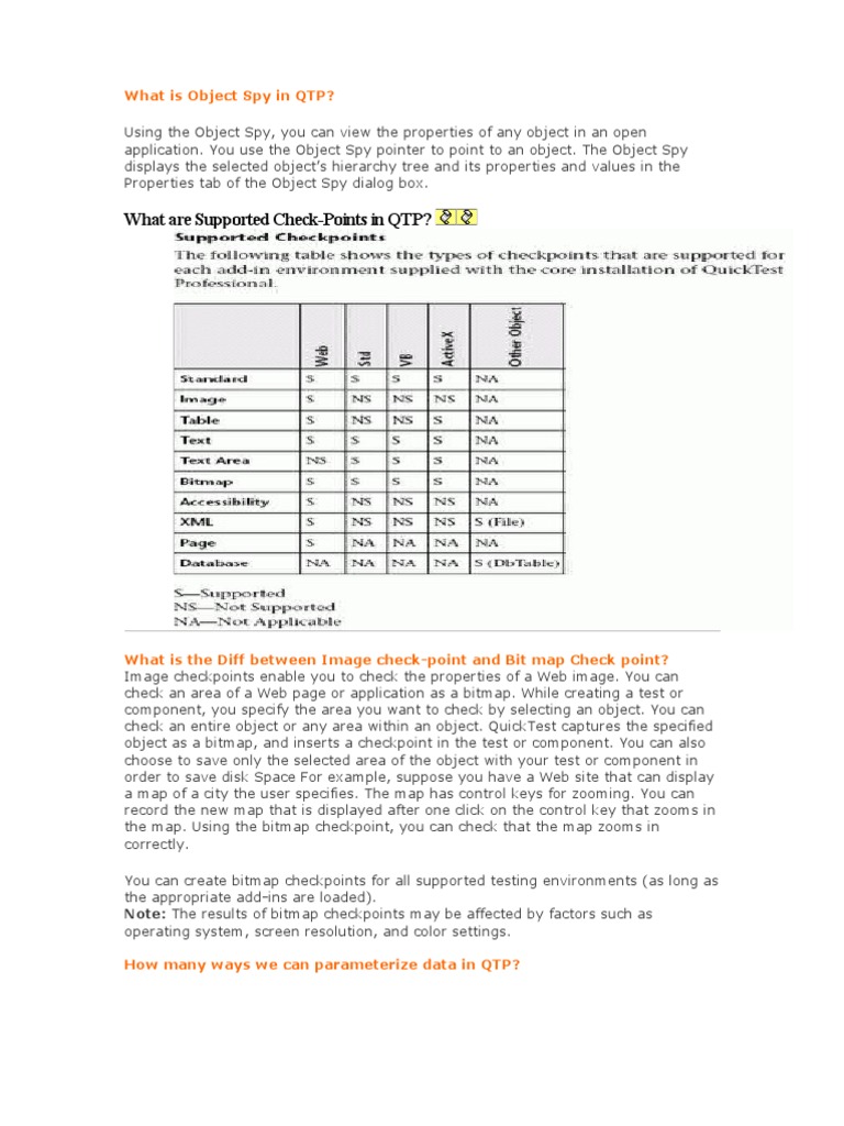 What is the Diff between Image check-point and Bit map Check point? Image checkpoints enable you to check the properties of a Web image. You can check an area of a Web page or application as a bitmap. While creating a test or component, you specify the area you want to check by selecting an object. You can check an entire object or any area within an object. QuickTest captures the specified object as a bitmap, and inserts a checkpoint in the test or component. You can also choose to save only the selected area of the object with your test or component in order to save disk Space For example, suppose you have a Web site that can display a map of a city the user specifies. The map has control keys for zooming. You can record the new map that is displayed after one click on the control key that zooms in the map. Using the bitmap checkpoint, you can check that the map zooms in correctly. You can create bitmap checkpoints for all supported testing environments (as long as the appropriate add-ins are loaded). Note: The results of bitmap checkpoints may be affected by factors such as operating system, screen resolution, and color settings. How many ways we can parameterize data in QTP?