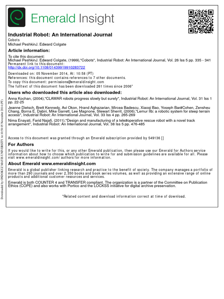 Michael PeshkinJ. Edward Colgate, (1999),"Cobots", Industrial Robot: An International Journal, Vol. 26 Iss 5 pp. 335 - 341