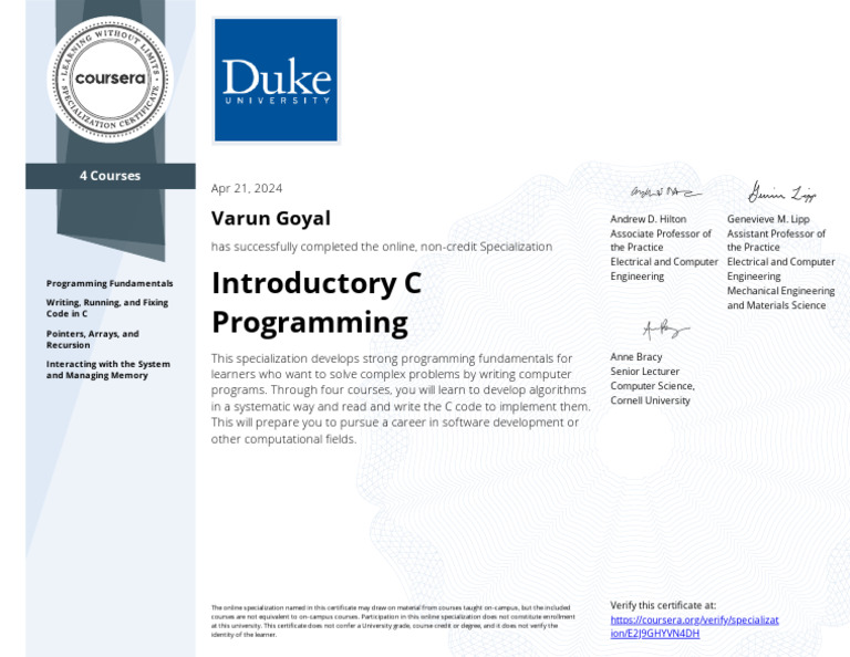 The online specialization named in this certificate may draw on material from courses taught on-campus, but the included Verify this certificate at:
