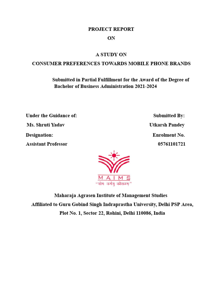 I hereby declare that this report titled “A study on Consumer Preferences towards Mobile Phone