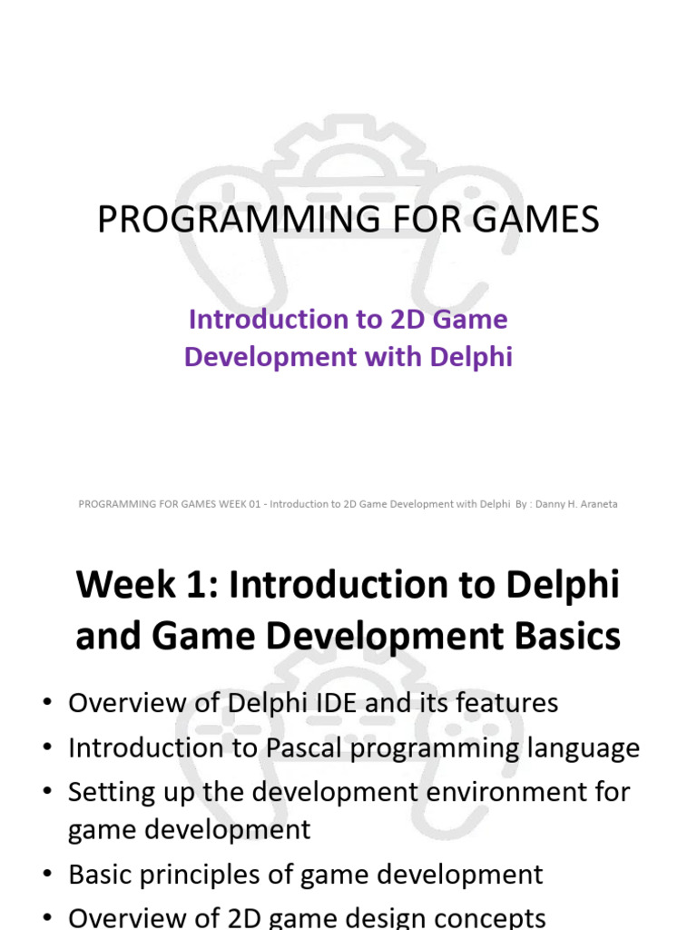 PROGRAMMING FOR GAMES WEEK 01 - Introduction to 2D Game Development with Delphi By : Danny H. Araneta