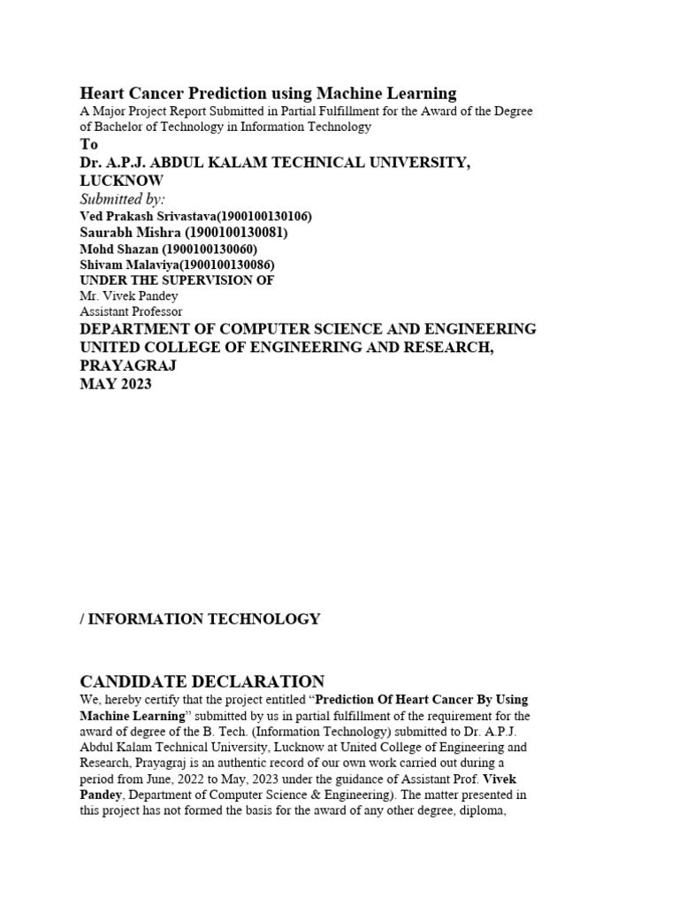 We, hereby certify that the project entitled “Prediction Of Heart Cancer By Using