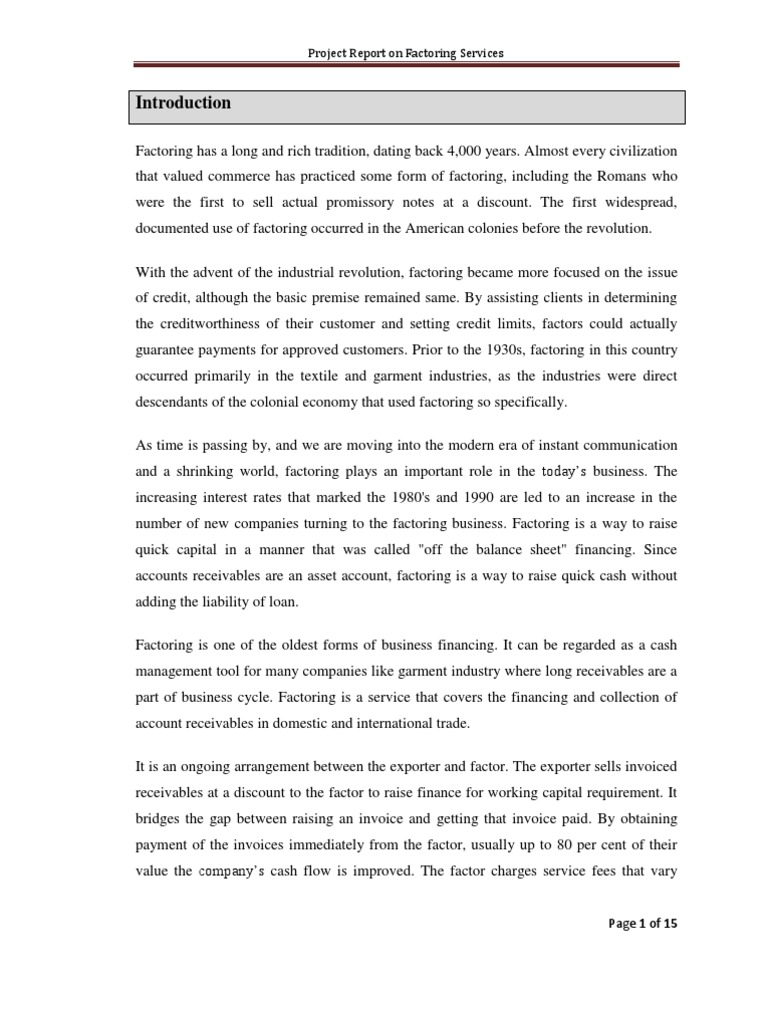 Factoring has a long and rich tradition, dating back 4,000 years. Almost every civilization that valued commerce has practiced some form of factoring, including the Romans who were the first to sell actual promissory notes at a discount. The first widespread, documented use of factoring occurred in the American colonies before the revolution. With the advent of the industrial revolution, factoring became more focused on the issue of credit, although the basic premise remained same. By assisting clients in determining the creditworthiness of their customer and setting credit limits, factors could actually guarantee payments for approved customers. Prior to the 1930s, factoring in this country occurred primarily in the textile and garment industries, as the industries were direct descendants of the colonial economy that used factoring so specifically. As time is passing by, and we are moving into the modern era of instant communication and a shrinking world, factoring plays an important role in the todays business. The increasing interest rates that marked the 1980's and 1990 are led to an increase in the number of new companies turning to the factoring business. Factoring is a way to raise quick capital in a manner that was called "off the balance sheet" financing. Since accounts receivables are an asset account, factoring is a way to raise quick cash without adding the liability of loan. Factoring is one of the oldest forms of business financing. It can be regarded as a cash management tool for many companies like garment industry where long receivables are a part of business cycle. Factoring is a service that covers the financing and collection of account receivables in domestic and international trade. It is an ongoing arrangement between the exporter and factor. The exporter sells invoiced receivables at a discount to the factor to raise finance for working capital requirement. It bridges the gap between raising an invoice and getting that invoice paid. By obtaining payment of the invoices immediately from the factor, usually up to 80 per cent of their value the companys cash flow is improved. The factor charges service fees that vary
