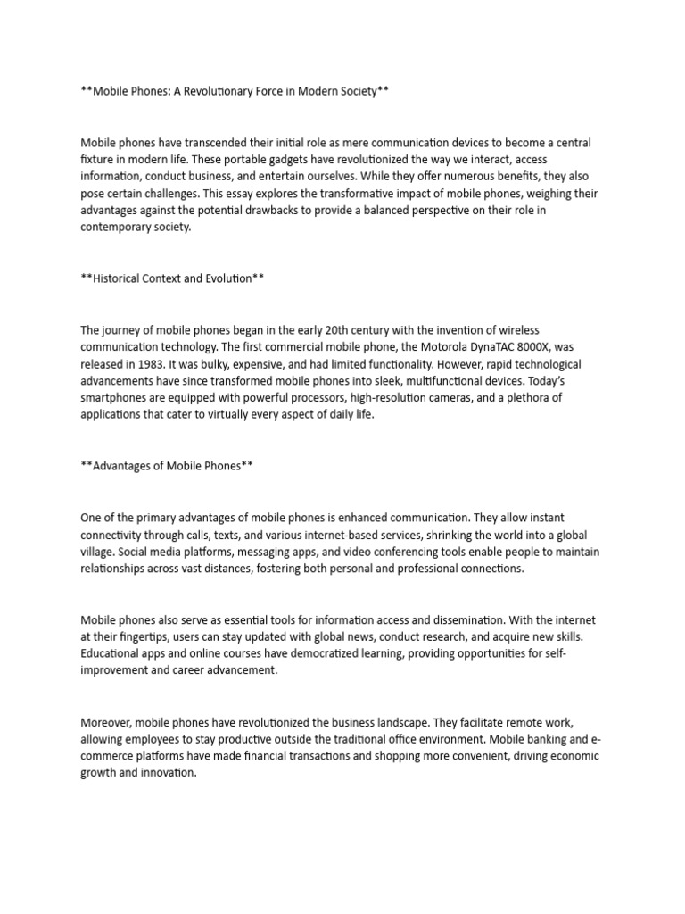 pose certain challenges. This essay explores the transformative impact of mobile phones, weighing their