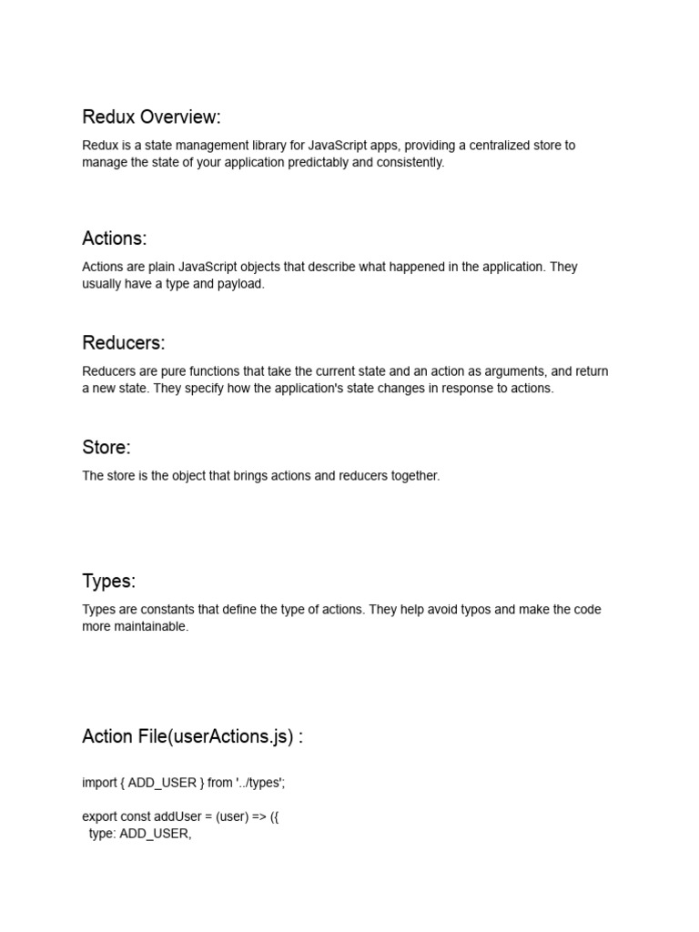 userActions.js defines an action creator addUser that creates an action to add a user.