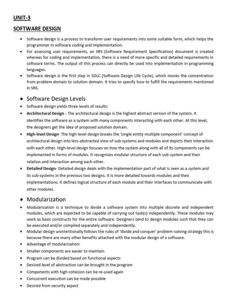 • Software design is the first step in SDLC (Software Design Life Cycle), which moves the concentration