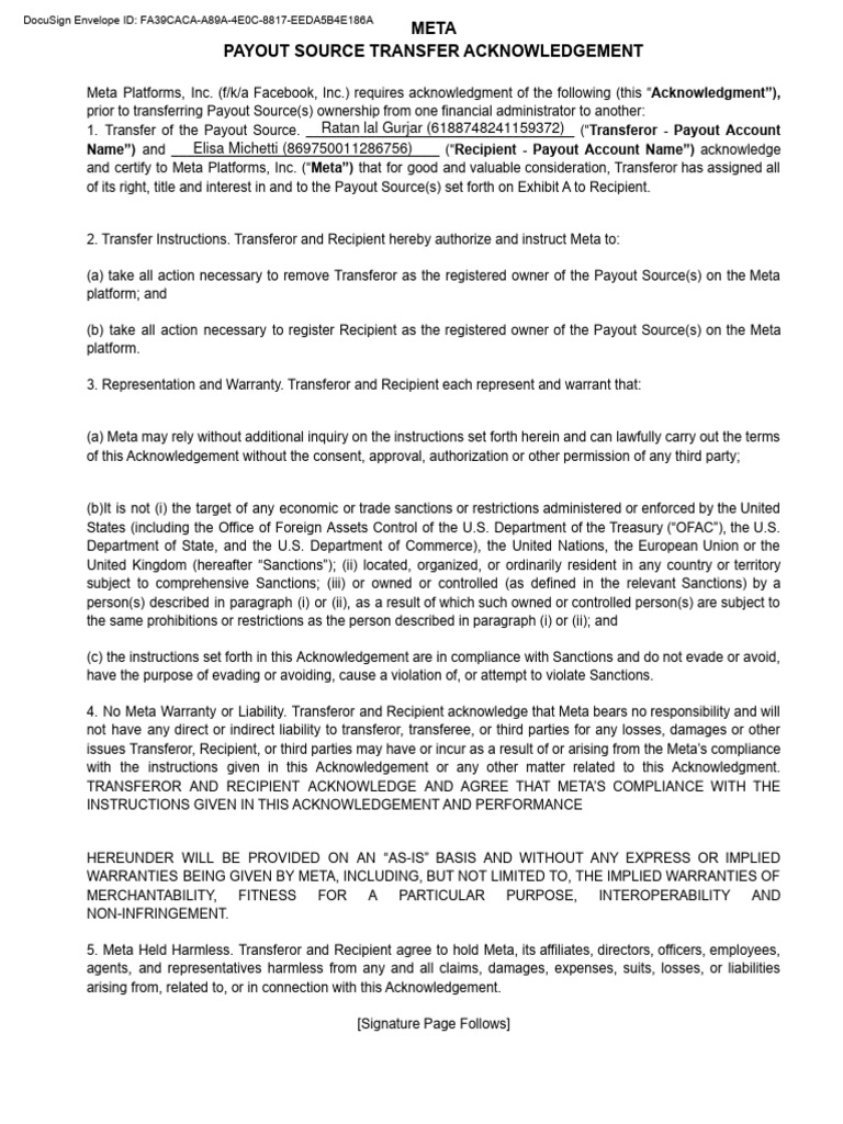 TRANSFEROR AND RECIPIENT ACKNOWLEDGE AND AGREE THAT META’S COMPLIANCE WITH THE