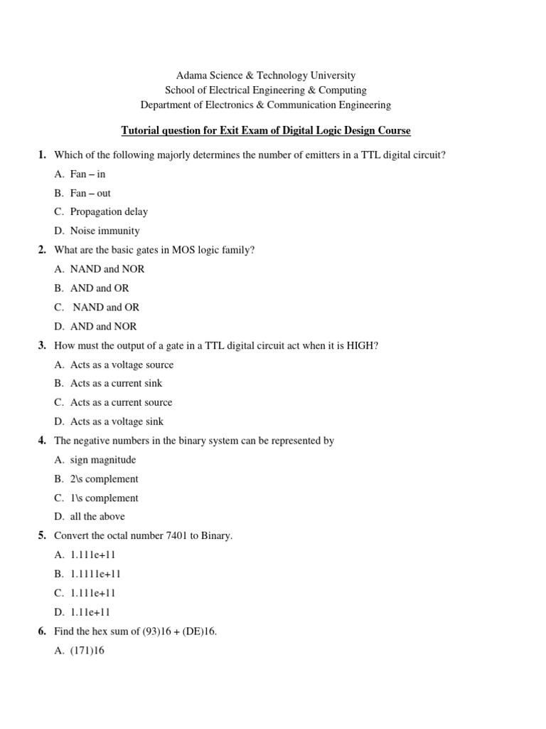 Tutorial question for Exit Exam of Digital Logic Design Course