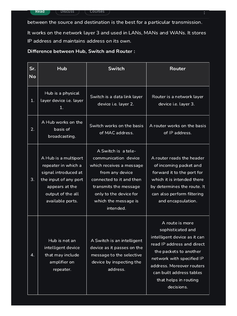 Difference between Hub, Switch and Router :