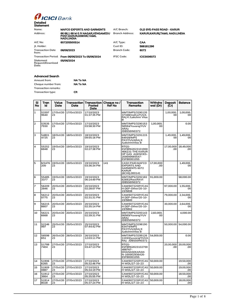 Transaction Period: From 06/06/2023 To 05/06/2024 IFSC Code: ICIC0006072