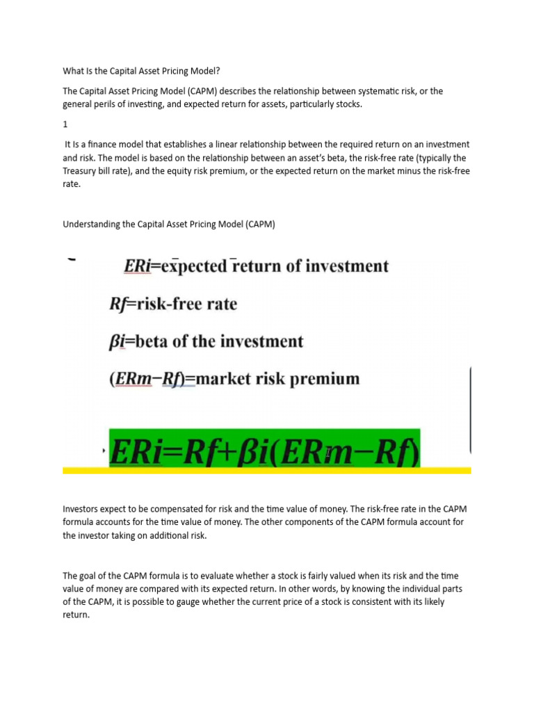 and risk. The model is based on the relationship between an asset’s beta, the risk-free rate (typically the