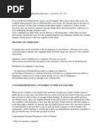 The key to measuring the effectiveness of the complaint management process is careful analysis of post-complaint customer feedback: Was the customer aware of the Complaint Process? Did the customer manage to speak with the correct staff member qualified to handle the complaint? Was the company defensive? Did the customer feel that their complaint received a fair hearing? Was the complaint fully understood? Was assistance offered or notice of impending decision given within a reasonable time? Did the customer understand the complaints process and if the decision was not in the customers favour, was the customer aware of any recourse? Was a reasonable solution reached and was this the preferred outcome for the customer? The key challenge for organisations today is to prioritise this post complaint analysis and encourage customer feedback both positive and negative. These complaints may find themselves in the public eye, via the media, and it is vital that organisations be seen to be trying to answer all complaints and deal with each one effectively. Over time sustained customer satisfaction will lead to stable views of an organisations reputation and consequently customer attitudes will be formed that ultimately encourage positive word of mouth and long term loyalty. BEST PRACTICE COMPLAINT HANDLING Best practice in complaint handling should really be analysed from two perspectives the customer and the company. From the customers perspective, the key measure is how satisfied was the customer with the process and will the customer recommend the organisation to a friend after the complaint is resolved, regardless of whether the outcome was favourable or not. The complaint should also be handled as quickly as possible and communication should be given at each step of the way of the complaints process. Customers who take the time to complain do so for both financial and emotional reasons and this should be understood for the complaints process to be deemed best practice in the eyes of the customer. From the companys perspective, complaints should really be seen as giving companies an opportunity to improve their business and focus on customer retention, rather than lose customers and spend a lot of money trying to win them back. Best practice in complaint handling from a company perspective is when a company actively seeks out people who complain in order to use their feedback to improve customer satisfaction levels. In these companies there is a culture that has effective processes in place to understand the complaints, providing accurate feedback to the relevant departments who can then actively learn from the complaint. Features of best practice in complaint handling are: Visible measures in place from a customers perspective e.g., how many people stay with company X after making a complaint. Clear understanding from the top of the organisation of what excellent complaint management looks like