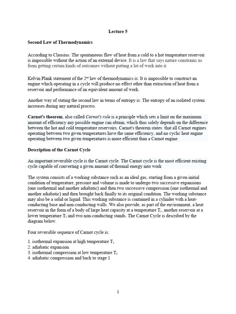 lower temperature T2 and two non-conducting stands. The Carnot Cycle is described by the
