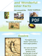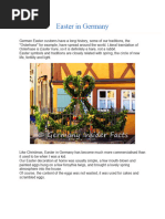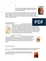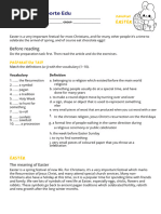 EASTER 1. Easter is a Christian religious holiday that commemorates the crucifixion and of Jesus Christ. These days, Easter has a lot of . traditions as well, which is why many nonChristians also celebrate it. a) revival, secular b) resurrection, sectional 2. Good Friday commemorates the crucifixion of Jesus Christ. It is an or "public" holiday in some parts of the English-speaking world. a) efficient b) official 3. Easter and all of its related holidays (Good Friday, Lent, etc.) are known as feasts/holidays, which means their date changes from year to year. a) movers b) moveable 4. One of the main Easter traditions is .. eggs which involves painting them in a variety of colours. a) decorating b) dressing 5. On Easter Sunday, many people participate in a traditional Easter egg .. the colored eggs are hidden by the parents, and the children have to look for them. a) look b) hunt 6. Many Christians (even the ones who don't normally go to church) attend .. on Easter Sunday. a) mass b) sermon 7. A very popular symbol of Easter is the Easter .. traditionally, he's the one who "hides" and delivers the eggs. a) Bunny b) Hare 8. Many families place coloured eggs, and other decorated items, in an Easter.. . These are given to children when they wake up on Easter Sunday. a) basket b) bowl 9. In England, many people . chocolate eggs instead of real ones. a)exchange b) change 10. Lent is a period of when one is not allowed to eat certain foods which starts 40 days before Easter. Most people no longer .. Lent. a) feasting, absolve b) fasting, observe SELF CHECK